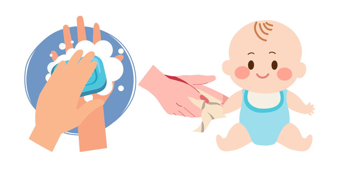 外から帰ったときは、大人だけでなく子どもも手を洗いましょう。できれば石けんを使うのが理想ですが、まだ上手に使えない子は、水で洗うだけでも十分効果があります。赤ちゃんの場合は、ぬれたタオルで指先までやさしく拭いてあげてください。